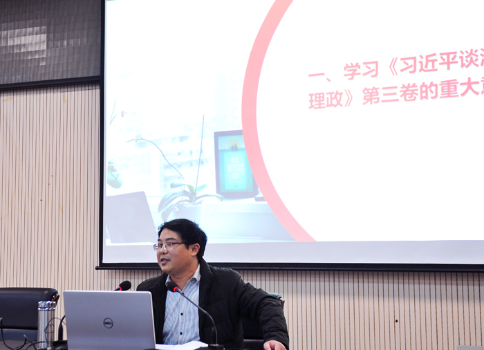 按照院党委部署安排,12月22日,机关第一、二、三党总支,后勤党总支在逸夫楼第二会议室联合举办学习《习近平谈治国理政》第三卷宣讲报告会,学院宣讲团成员、马克思主义学院党总支书记赵国付作专题报告。院党委委员、副院长李亮、梁琦以普通党员身份与四个党总支全体党员同志们一起聆听了报告,报告会由机关第一党总支书记王卫林主持。